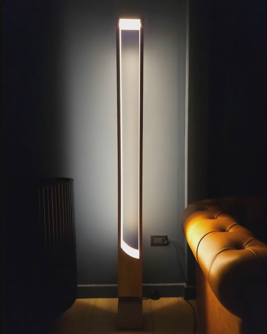 Lámpara de pie en madera nativa con base de hormigón y difusor LED. Pensada para acompañar cualquier living sin ocupar mucho espacio, pero con un protagonismo incuestionable.